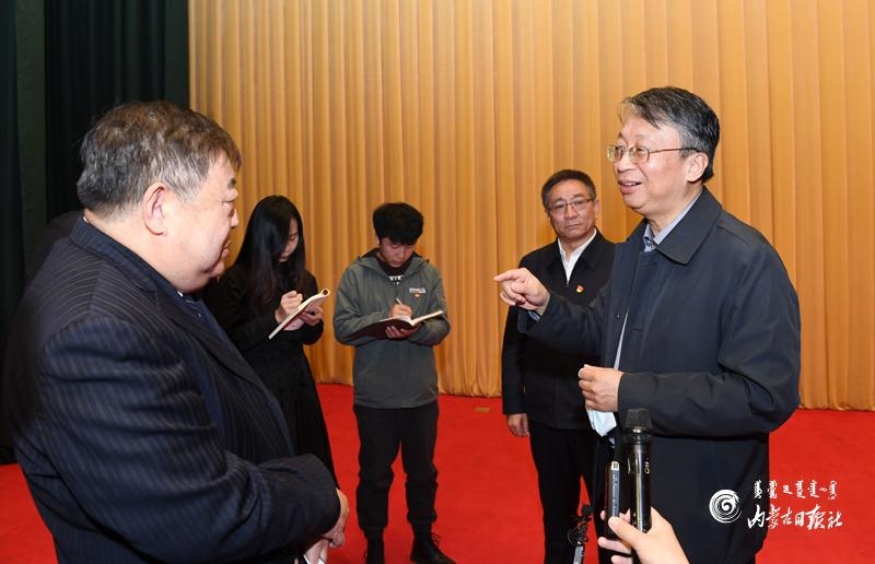 11月8日上午,在學(xué)習(xí)貫徹黨的十九屆五中全會(huì)精神中央宣講團(tuán)內(nèi)蒙古報(bào)告會(huì)結(jié)束后,聆聽報(bào)告會(huì)的部分人員與宣講人沈春耀互動(dòng)交流。內(nèi)蒙古日?qǐng)?bào)記者 袁永紅 攝