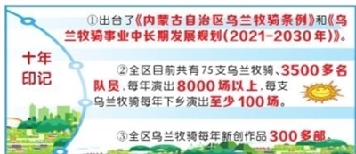 黨的十八大以來,烏蘭牧騎事業(yè)發(fā)展進入快車道。自治區(qū)制定了一系列加快推進烏蘭牧騎事業(yè)發(fā)展的政策,出臺了《內(nèi)蒙古自治區(qū)烏蘭牧騎條例》和《烏蘭牧騎事業(yè)中長期發(fā)展規(guī)劃(2021-2030年)》。設立全區(qū)烏蘭牧騎事業(yè)發(fā)展專項經(jīng)費,為75支烏蘭牧騎配備演出大巴車,新建烏蘭牧騎宮,舉辦烏蘭牧騎藝術(shù)節(jié)、全區(qū)烏蘭牧騎新人新作比賽,開展全區(qū)烏蘭牧騎交流演出、“烏蘭牧騎月”等活動,促進烏蘭牧騎互相學習發(fā)展。開發(fā)“網(wǎng)上烏蘭牧騎”PC版網(wǎng)頁和手機版微信H5,成立烏蘭牧騎輔導工作隊、志愿服務工作隊,為基層農(nóng)牧民提供藝術(shù)培訓服務。以“烏蘭牧騎+”的方式深入基層,開展理論宣講、電影放映、法律咨詢等綜合志愿服務。加強烏蘭牧騎人才隊伍建設,在錫林郭勒職業(yè)學院等設立烏蘭牧騎人才培訓基地,舉辦全區(qū)烏蘭牧騎隊長培訓班、舞臺藝術(shù)創(chuàng)作培訓班等業(yè)務培訓班。組織實施《烏蘭牧騎原創(chuàng)經(jīng)典作品名錄》工作和《全區(qū)烏蘭牧騎原創(chuàng)經(jīng)典作品傳承工程》。編輯出版《烏蘭牧騎回憶錄》《烏蘭牧騎優(yōu)秀作品選》。組織啟動烏蘭牧騎知識產(chǎn)權(quán)保護工作。