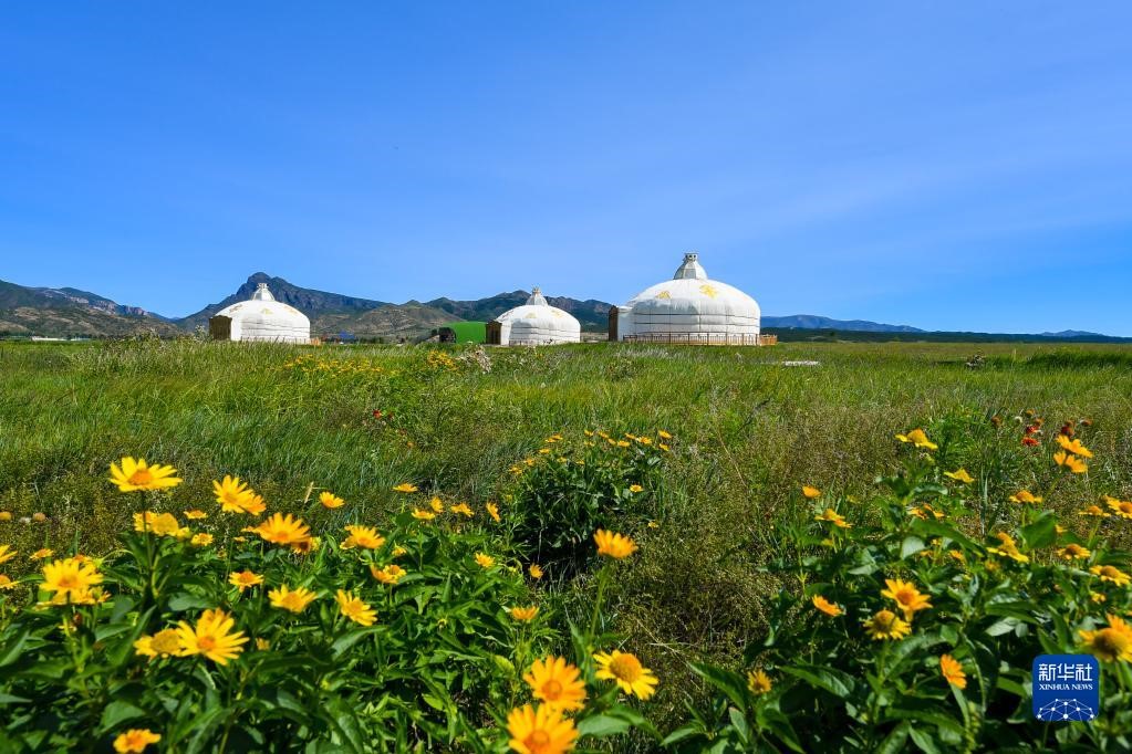 初秋的敕勒川草原,花香、草香撲面而來,綠草之間泛著淡淡鵝黃,與白、紅、紫等各色小花繪成一幅層次鮮明的風(fēng)景畫。