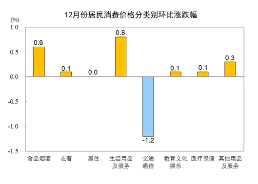 12月份,全國居民消費(fèi)價(jià)格環(huán)比上漲0.1%。其中,城市上漲0.1%,農(nóng)村上漲0.1%;食品價(jià)格上漲0.9%,非食品價(jià)格下降0.1%;消費(fèi)品價(jià)格上漲0.1%,服務(wù)價(jià)格上漲0.1%。