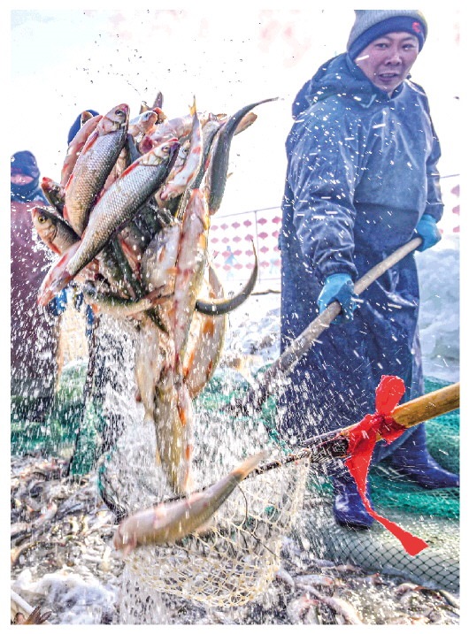 ▲1月13日,達(dá)里湖漁場(chǎng)的工作人員在撈魚裝箱。日前,內(nèi)蒙古達(dá)里湖冬捕旅游季在赤峰市克什克騰旗拉開帷幕。此次活動(dòng)包括祭湖儀式、開湖捕魚、文藝展演等多個(gè)項(xiàng)目,吸引眾多游人前來(lái)觀看。新華社記者彭源攝