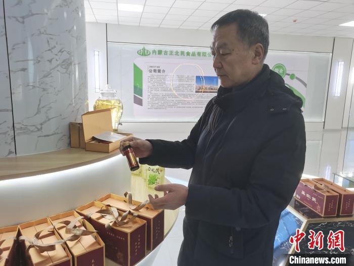 圖為范文宏為記者展示他的黃芪產(chǎn)品。李?lèi)?ài)平攝