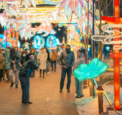 當(dāng)晚,呼和浩特零下15攝氏度左右,寒冷擋不住市民欣賞流光溢彩的燈會(huì),只見市民穿著保暖的外套,戴著帽子手套,一邊逛燈會(huì),一邊拍照片、拍視頻,還有的市民開直播,與全國各地的網(wǎng)友一起分享這美好時(shí)刻。