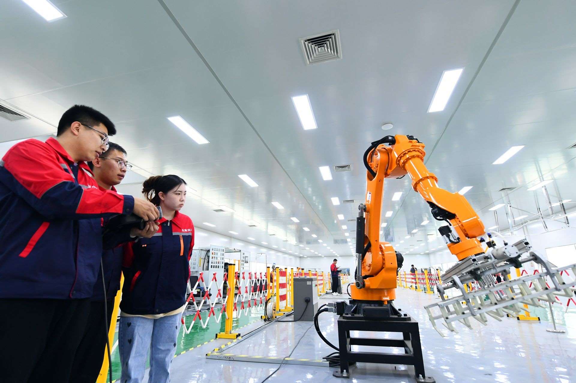 包頭稀土高新技術(shù)產(chǎn)業(yè)開發(fā)區(qū)高新技術(shù)特色產(chǎn)業(yè)基地北科交大機(jī)器人展廳,工作人員正在調(diào)試碼垛轉(zhuǎn)運(yùn)六軸機(jī)器人。草原全媒記者金泉攝