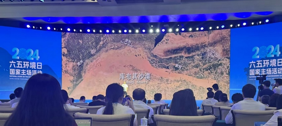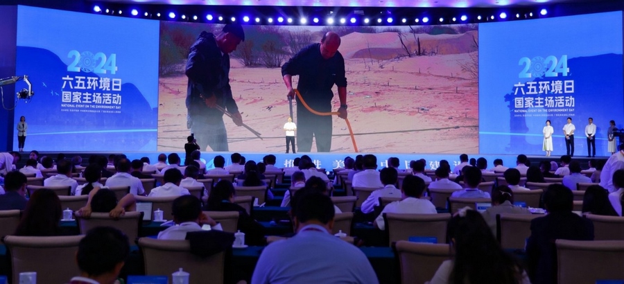 當天在廣西南寧,生態(tài)環(huán)境部、中央文明辦、廣西壯族自治區(qū)人民政府聯(lián)合舉辦了2024年六五環(huán)境日國家主場活動。建設美麗中國,是實現(xiàn)中華民族偉大復興中國夢的重要內(nèi)容。在習近平生態(tài)文明思想指引下,一個人與自然和諧共生的美麗中國正從藍圖變?yōu)楝F(xiàn)實?;顒犹貏e設立了“從這里看見美麗中國”主題展示環(huán)節(jié),從全國各地的案例中遴選了6個“美麗中國建設創(chuàng)新示范案例”,內(nèi)蒙古杭錦旗庫布其沙漠億利生態(tài)示范區(qū)“綠水青山就是金山銀山”實踐創(chuàng)新基地作為唯一的“兩山”基地案例在活動現(xiàn)場進行了展示。來自億利資源集團的庫布其治沙工程師田旺應邀參加活動,他結合親身經(jīng)歷,向全球嘉賓介紹了政府、企業(yè)、農(nóng)牧民合力治理庫布其沙漠三十多年,在生態(tài)文明思想引領下將“死亡之海”建設成為生命綠洲的生動故事。