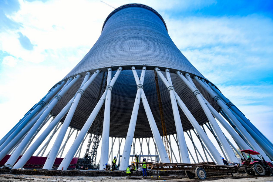 12月6日,在內蒙古呼和浩特市土默特左旗內蒙古能源集團金山熱電三期項目建設現場,工人們正有序進行著設備安裝等工作。進入該項目間冷塔內部,抬頭仰望,仿佛一只巨大的眼睛凝視,未來該項目投產后可實現年發(fā)電量100億千瓦時,新增供熱面積5000萬平方米,將溫暖送至千家萬戶。(楊鑫 攝)