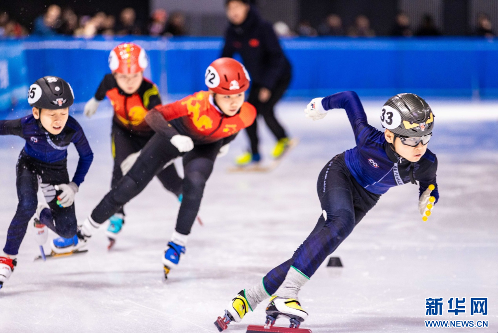 ??12月15日,參賽小選手在呼和浩特市冰雪運(yùn)動系列活動短道速滑公開賽比賽中。新華網(wǎng)發(fā)(丁根厚 攝)
