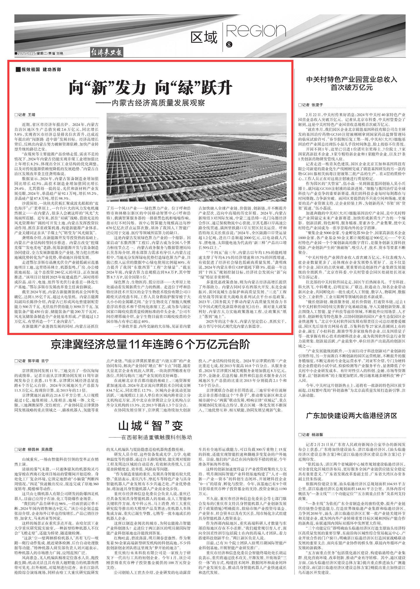 2025年2月25日《經(jīng)濟(jì)參考報》第8版刊發(fā)了《向“新”發(fā)力 向“綠”躍升——內(nèi)蒙古經(jīng)濟(jì)高質(zhì)量發(fā)展觀察》的文章,報道了多重優(yōu)惠政策疊加,為內(nèi)蒙古經(jīng)濟(jì)高增長提供了外部助力,經(jīng)濟(jì)社會發(fā)展向“新”向“綠”特征非常鮮明,讓政策從“紙上”落到“地上”。