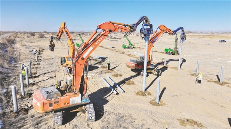 引孔機、打樁機轟鳴聲不絕于耳,打樁機將一根根水泥樁“釘”入地面中……連日來,巴彥淖爾市臨河區(qū)新華林場防沙治沙和光伏一體化項目施工現(xiàn)場多臺作業(yè)車輛同時進行樁基作業(yè),現(xiàn)場還不時有工作人員對打樁等基礎工作進行抽檢抽查,確保施工質(zhì)量。