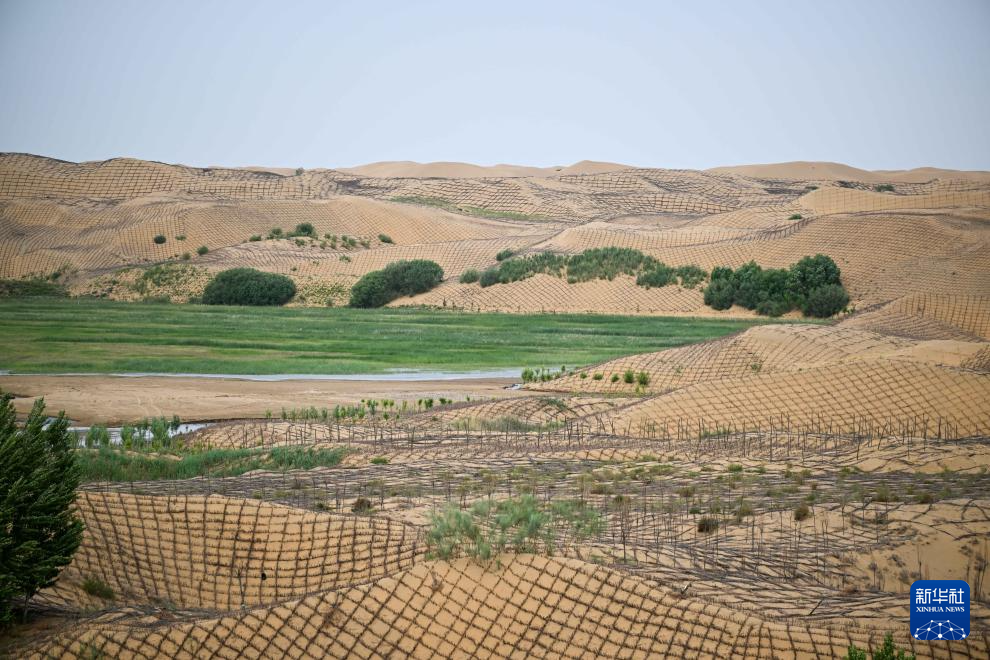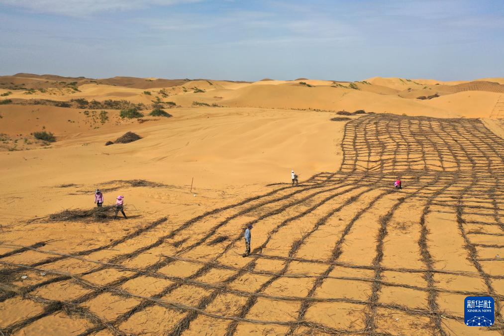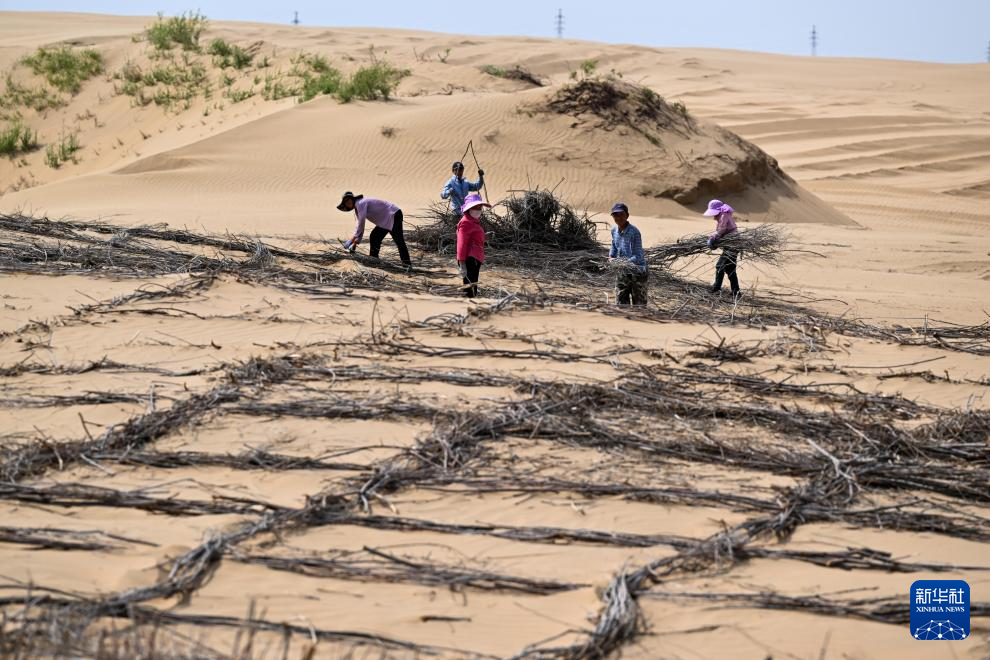 6月7日,在鄂爾多斯市達拉特旗境內的庫布其沙漠,工人在治沙 新華社記者 李志鵬 攝