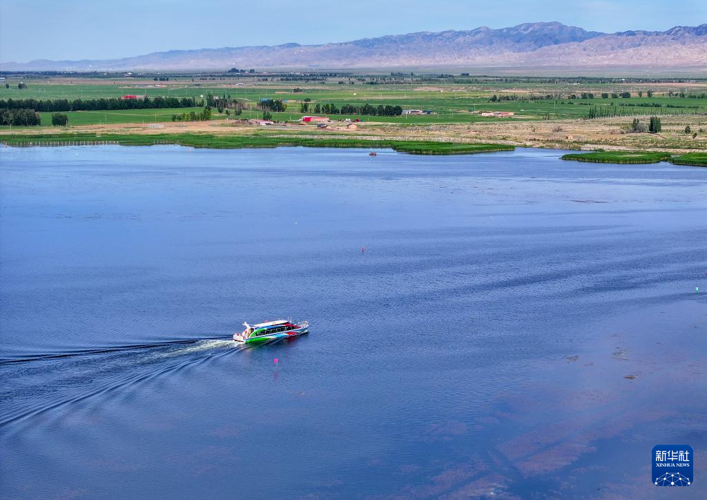 6月5日,在巴彥淖爾市磴口縣奈倫湖國家濕地公園,摩托艇行駛在湖面上(無人機照片)新華社記者 李志鵬 攝