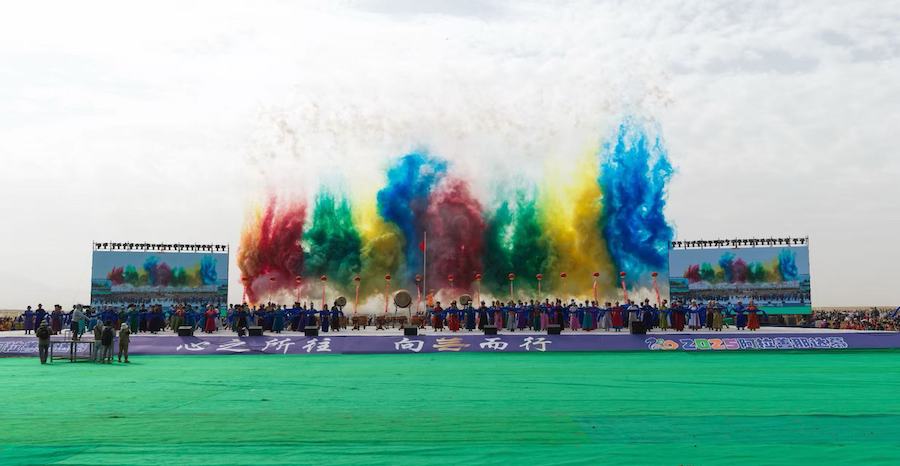 2025阿拉善那達(dá)慕開(kāi)幕式現(xiàn)場(chǎng),舞臺(tái)上五彩煙霧升騰
