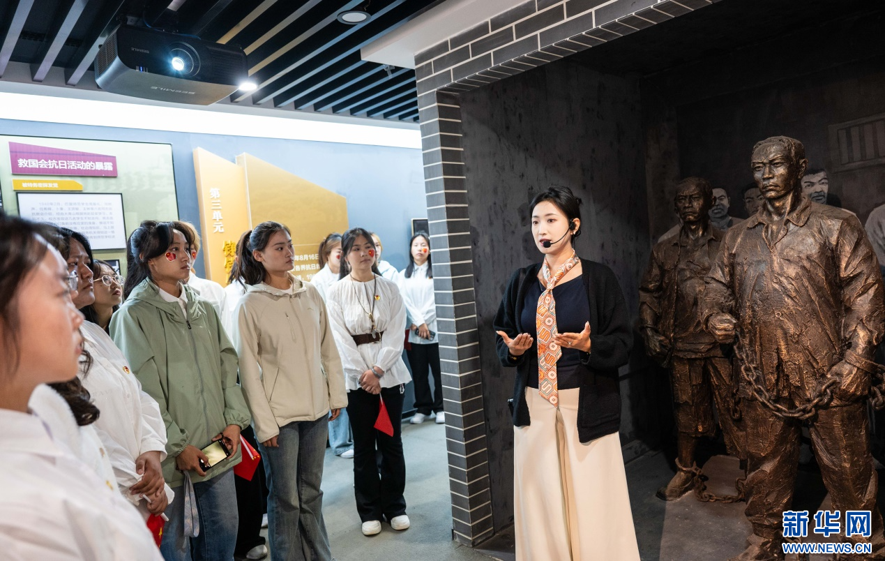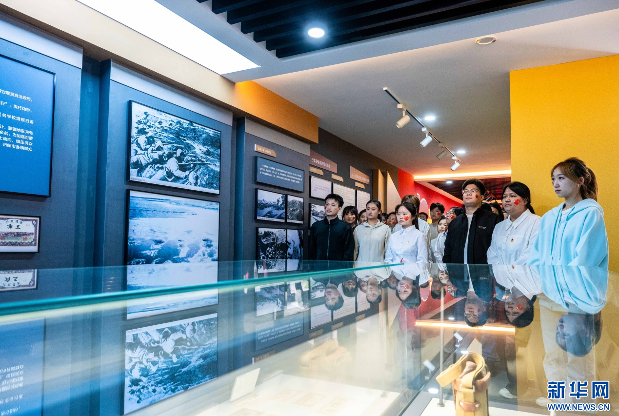 ??10月1日,內(nèi)蒙古師范大學(xué)馬克思主義學(xué)院的學(xué)子們在綏蒙各界抗日救國會舊址紀(jì)念館參觀研學(xué)。新華網(wǎng)發(fā)(丁根厚 攝)