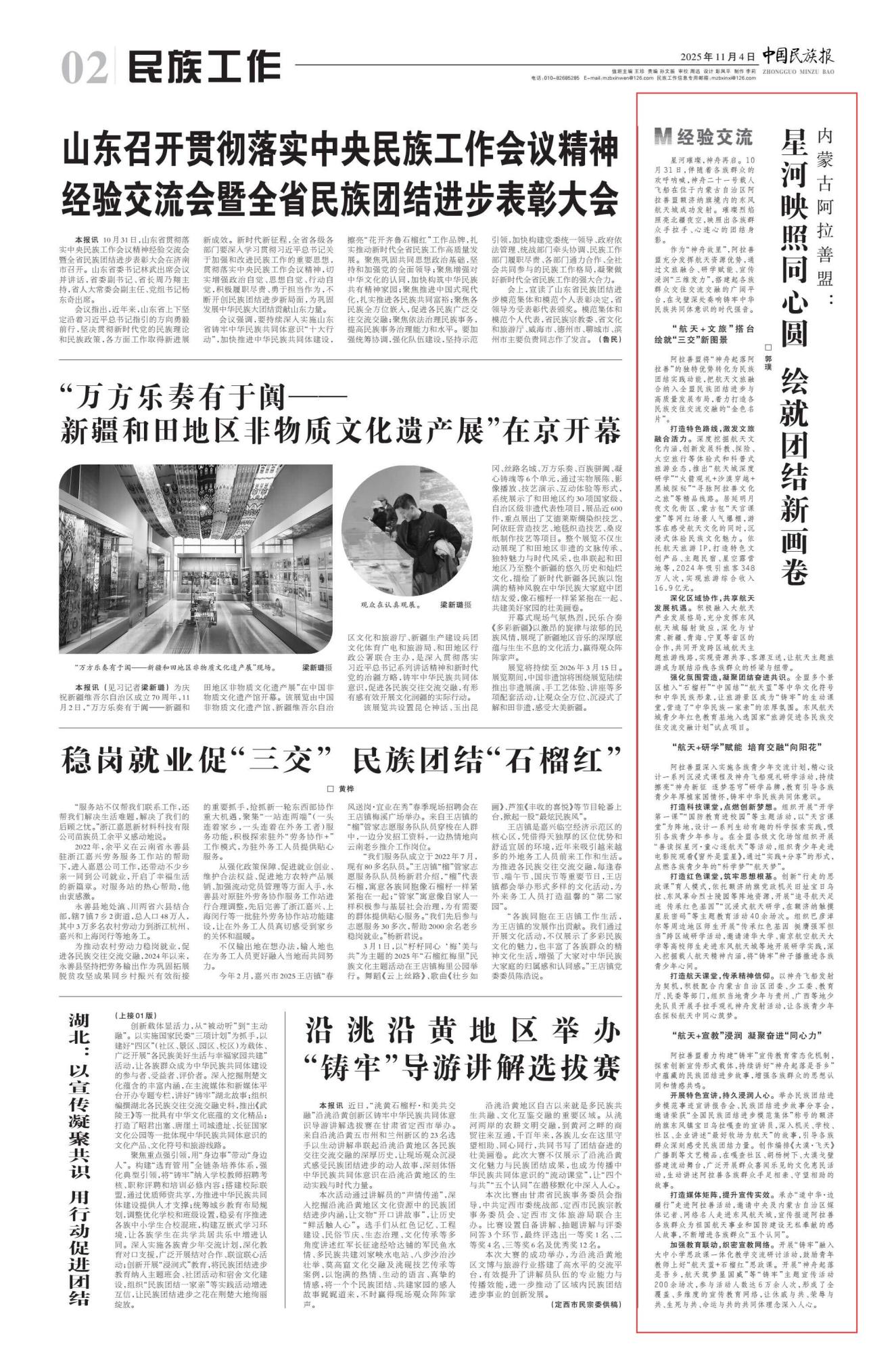 2025年11月4日,《中國(guó)民族報(bào)》第2版刊發(fā)題為《內(nèi)蒙古阿拉善盟:星河映照同心圓 繪就團(tuán)結(jié)新畫(huà)卷》的文章,報(bào)道了伴隨著各族群眾的歡呼吶喊,神舟二十一號(hào)載人飛船在位于內(nèi)蒙古自治區(qū)阿拉善盟額濟(jì)納旗境內(nèi)的東風(fēng)航天城成功發(fā)射。璀璨烈焰照亮北疆夜空,映照出各族群眾手拉手、心連心的團(tuán)結(jié)身影。