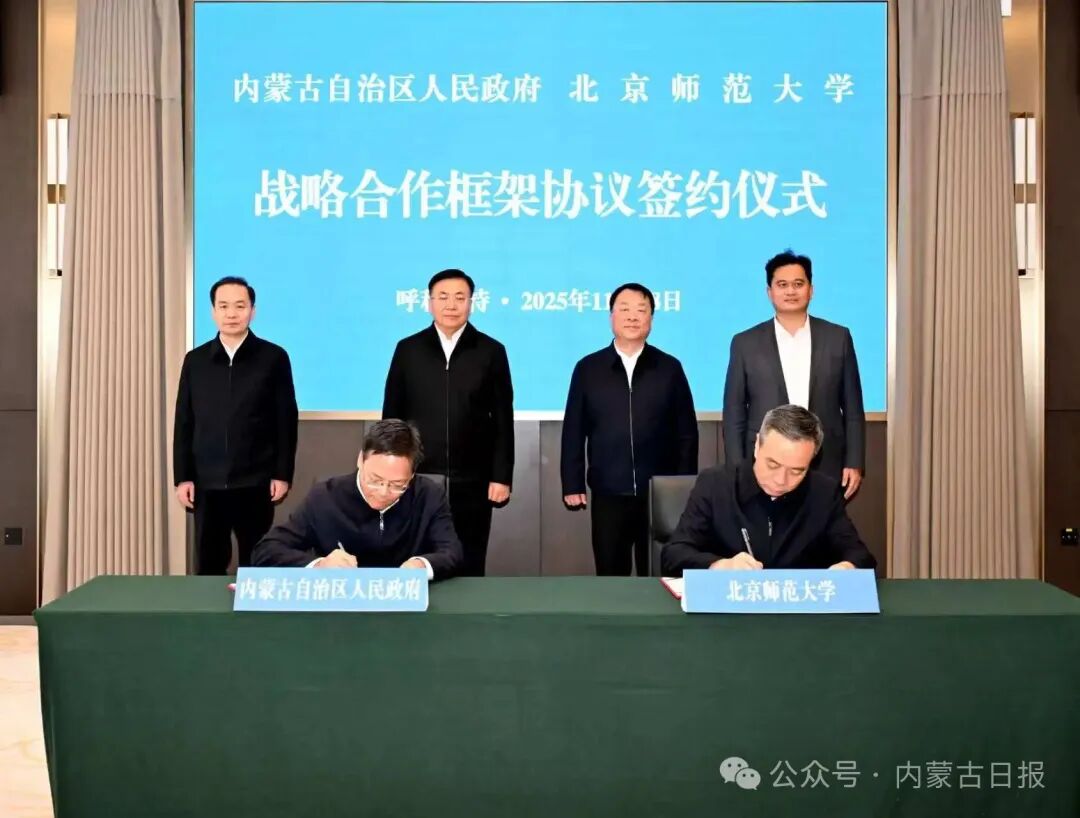 11月18日,自治區(qū)黨委副書記、自治區(qū)人民政府主席包鋼與北京師范大學(xué)黨委書記程建平共同見證自治區(qū)人民政府與北京師范大學(xué)簽署戰(zhàn)略合作框架協(xié)議。草原云·內(nèi)蒙古新聞網(wǎng)記者 韓卿立 攝