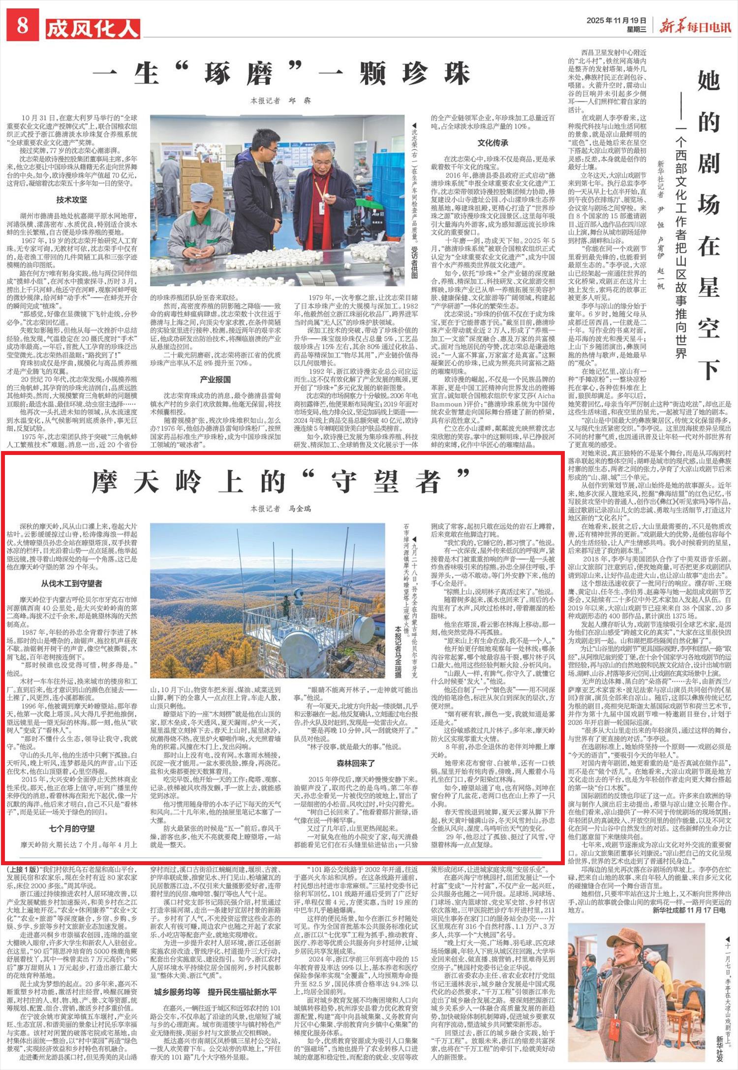 2025年11月19日,《新華每日電訊》第8版刊發(fā)題為《摩天嶺上的“守望者”》的文章,報道了摩天嶺位于內蒙古呼倫貝爾市牙克石市綽河源鎮(zhèn)西南40公里處,是大興安嶺嶺南的第二高峰?;鹎椴t望員孫忠全站在瞭望塔頂,雙手扶著冰涼的欄桿,目光沿著山勢一點點延展。他舉起望遠鏡,搜尋著山坳深處的每一個角落。這已是他在摩天嶺守望的第29個年頭。