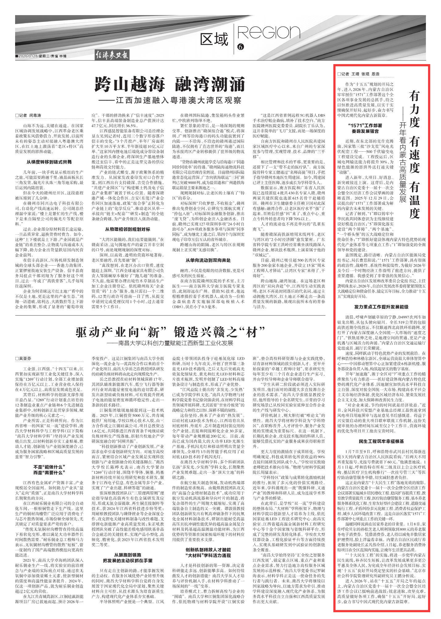 2026年1月28日《經(jīng)濟參考報》第6版刊發(fā)了《有力度 有速度 有溫度——開年看內(nèi)蒙古高質(zhì)量發(fā)展》的文章,報道了進入2026年,站在“十五五”開局之年的起點上,內(nèi)蒙古自治區(qū)黨委十一屆十一次全會暨全區(qū)經(jīng)濟工作會議已擂響前進戰(zhàn)鼓:銳意進取,攻堅克難,高質(zhì)量做好各項工作,確保“十五五”開好局、起好步,奮力書寫中國式現(xiàn)代化內(nèi)蒙古新篇章。