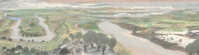 河北塞罕壩林場,是“三北”工程建設的重要區(qū)域?;脑兞趾5娜眽纹孥E,成為近年來主題性美術創(chuàng)作的重要課題。入選“筑夢——我們的新時代美術攝影作品展”的譚智群油畫《美麗的塞罕壩》,是在實地寫生基礎上的藝術提煉和情感升華。作者以俯視的構圖,鋪展?jié)M目蒼翠的美景。畫面左側,清澈的河流蜿蜒向前;畫面右側,白色的雁群逐綠翱翔;遠方,茂密的森林不斷延伸,風力發(fā)電機林立于山巔,畫面充滿生機與活力。同樣以俯視的角度處理構圖,孔亮油畫《美麗中國——塞罕壩》則以塞罕壩林場和塞罕塔為視覺中心,蔥蘢的綠意,將意境渲染得更加深邃。翁凱旋油畫《滄海桑田——塞罕壩的前世今生》,通過三聯畫的形式,在新舊對比中構建時空長廊,描繪出塞罕壩的時代變遷。