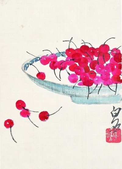 展柜中,不大的冊頁引得眾人圍觀。顆顆櫻桃被齊白石描繪得鮮嫩欲滴,它們擠在一個素樸的青花瓷盤中,還有幾顆散落在外,尤其鮮亮奪目。《盤中櫻桃》是齊白石《聚珍十開冊》中的一幅,作于20世紀30年代。在這套冊頁中,無論是荷花游魚、麥穗螞蚱還是汀渚魚鷹,都在齊白石筆下顯得格外逼真?zhèn)魃瘛?/p>