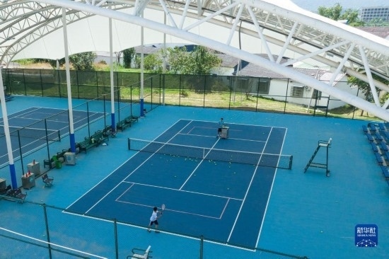 8月9日拍攝的京山文峰網(wǎng)球特色村網(wǎng)球訓(xùn)練場(chǎng)(無人機(jī)照片)。