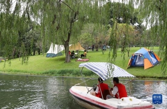 10月4日,在上海閔行體育公園,游船從岸邊露營(yíng)地旁劃過(guò)。