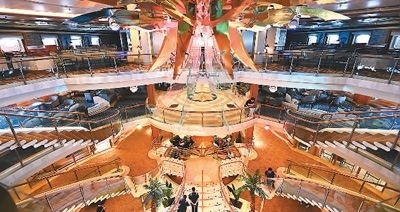 遠觀“愛達·魔都號”,層疊密布的艙室和舷窗能承載5246人;走進船體內(nèi)部,高達16層、超過4萬平方米的生活娛樂區(qū)域內(nèi),劇場、泳池、健身房、餐廳、畫廊等娛樂設施應有盡有,儼然是一座“移動的海上城市”。