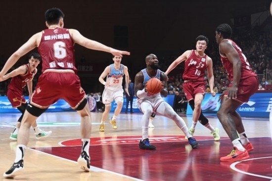 5月9日,新疆隊球員瓊斯(右三)在比賽中進攻。新華社記者 黃宗治 攝