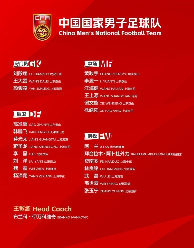 以下為24人大名單:武磊、顏駿凌、蔣光太、魏震(上海海港),王大雷、劉洋、高準(zhǔn)翼、黃政宇、謝文能、李源一(山東泰山),韋世豪(成都蓉城),費(fèi)南多、蔣圣龍、徐皓陽、楊澤翔、汪海?。ㄉ虾I昊ǎ?,李磊、張玉寧、林良銘(北京國安),劉殿座(武漢三鎮(zhèn)),韓鵬飛(天津津門虎),王上源(河南),拜合拉木·阿卜杜外力(深圳新鵬城),阿蘭(青島西海岸)。