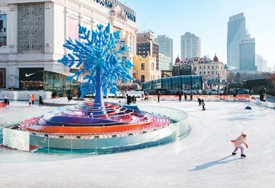 在哈爾濱市南崗區(qū)一處公益冰場(chǎng),人們?cè)凇氨┲凇钡袼芘曰?/p>