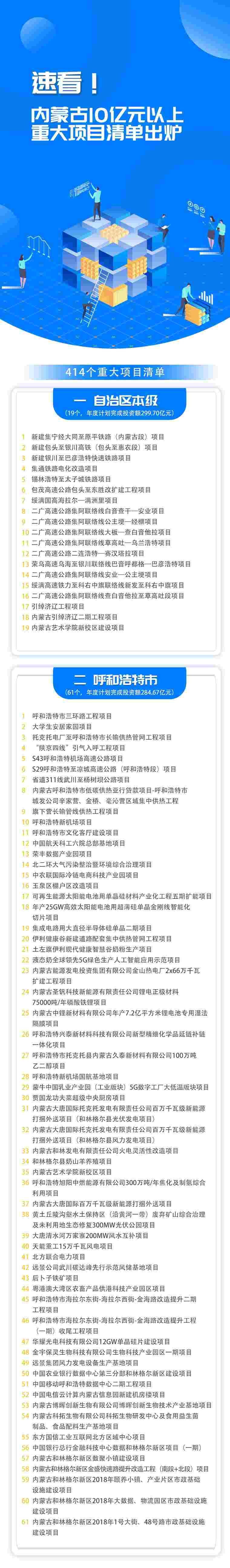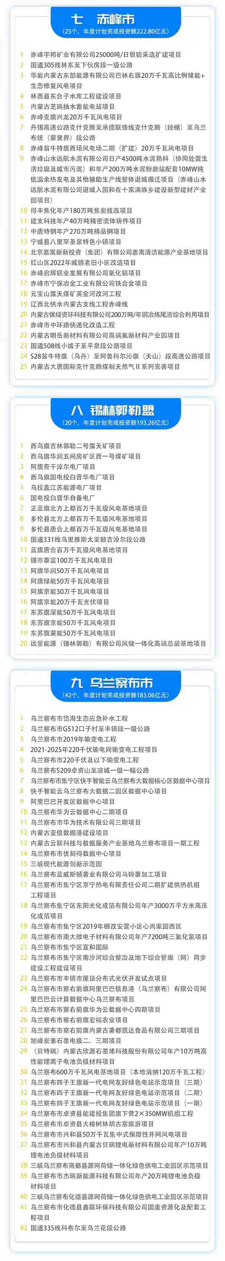 分盟市看,呼和浩特市計(jì)劃實(shí)施項(xiàng)目61個(gè),包頭市60個(gè),呼倫貝爾市15個(gè),興安盟20個(gè),通遼市23個(gè),赤峰市25個(gè),錫林郭勒盟20個(gè),烏蘭察布市42個(gè),鄂爾多斯市69個(gè),巴彥淖爾市19個(gè),烏海市20個(gè),阿拉善盟21個(gè)。