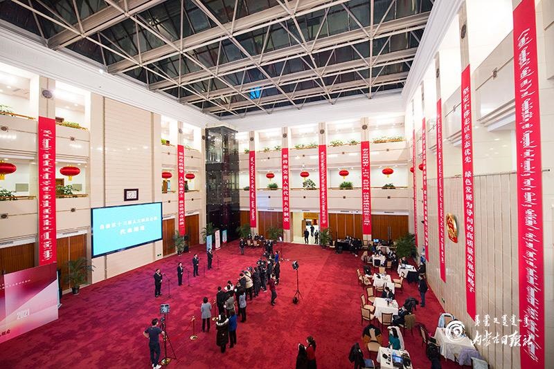 1月27日晚,自治區(qū)十三屆人大四次會(huì)議“代表通道”集中采訪(fǎng)活動(dòng)在內(nèi)蒙古人民會(huì)堂玻璃廳舉行,8位人大代表分兩組“亮相”。這是自治區(qū)人大首次開(kāi)通“代表通道”。內(nèi)蒙古日?qǐng)?bào)記者 金泉 攝