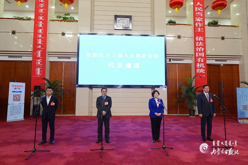 1月27日晚,自治區(qū)十三屆人大四次會(huì)議“代表通道”集中采訪(fǎng)活動(dòng)在內(nèi)蒙古人民會(huì)堂玻璃廳舉行,8位人大代表分兩組“亮相”。這是自治區(qū)人大首次開(kāi)通“代表通道”。圖為人大代表樸成奎、胡成東、云霖瓊和李全文4位代表(從左至右)回答記者提問(wèn)。內(nèi)蒙古日?qǐng)?bào)記者 金泉 攝