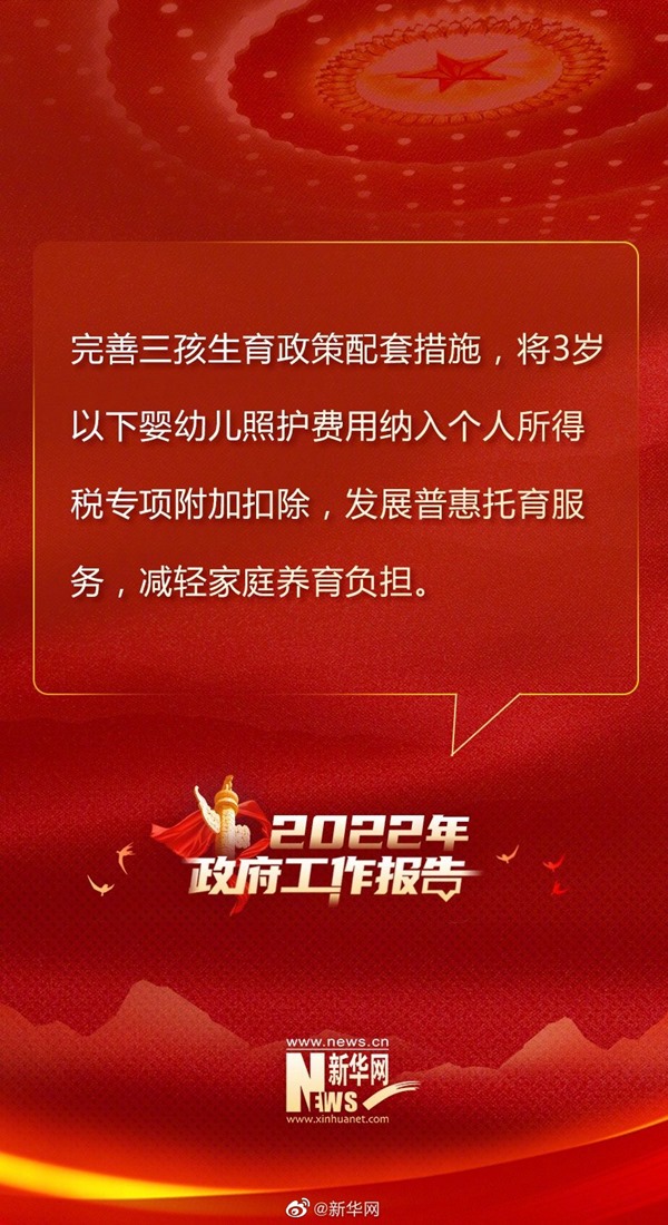 加強(qiáng)社會(huì)保障和服務(wù)。穩(wěn)步實(shí)施企業(yè)職工基本養(yǎng)老保險(xiǎn)全國(guó)統(tǒng)籌,適當(dāng)提高退休人員基本養(yǎng)老金和城鄉(xiāng)居民基礎(chǔ)養(yǎng)老金標(biāo)準(zhǔn),確保按時(shí)足額發(fā)放。繼續(xù)規(guī)范發(fā)展第三支柱養(yǎng)老保險(xiǎn)。加快推進(jìn)工傷和失業(yè)保險(xiǎn)省級(jí)統(tǒng)籌。做好軍人軍屬、退役軍人和其他優(yōu)撫對(duì)象優(yōu)待撫恤工作。積極應(yīng)對(duì)人口老齡化,優(yōu)化城鄉(xiāng)養(yǎng)老服務(wù)供給,支持社會(huì)力量提供日間照料、助餐助潔、康復(fù)護(hù)理等服務(wù),鼓勵(lì)發(fā)展農(nóng)村互助式養(yǎng)老服務(wù),推動(dòng)老齡事業(yè)和產(chǎn)業(yè)高質(zhì)量發(fā)展。完善三孩生育政策配套措施,將3歲以下嬰幼兒照護(hù)費(fèi)用納入個(gè)人所得稅專項(xiàng)附加扣除,發(fā)展普惠托育服務(wù),減輕家庭養(yǎng)育負(fù)擔(dān)。強(qiáng)化未成年人保護(hù)。提升殘疾預(yù)防和康復(fù)服務(wù)水平。加強(qiáng)民生兜底保障和遇困群眾救助,努力做到應(yīng)保盡保、應(yīng)助盡助。