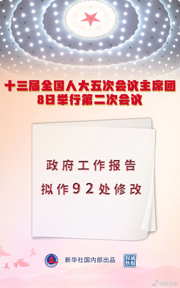 記者8日從十三屆全國人大五次會議主席團第二次會議上獲悉,政府工作報告擬作92處修改?! ?br/>