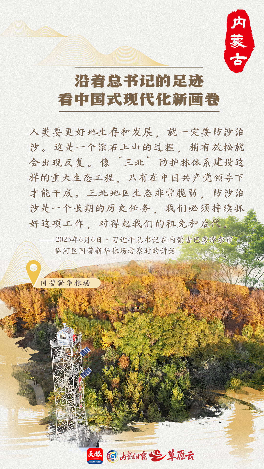 緩步登上30米高的瞭望塔,眼里是一望無際的林木。巴彥淖爾市臨河區(qū)國營新華林場副場長葛文斌深呼一口新鮮空氣,臉上閃現(xiàn)出自豪的表情?!斑@片林子凝結(jié)了三代人的心血?。 彼蛔「锌?,“這里曾經(jīng)是一望無際的沙丘、荒灘、鹽堿地,經(jīng)過60余年的艱苦奮斗,國營新華林場累計(jì)造林3.9萬畝、植樹430萬株,讓堿灘變良田、荒漠變綠洲,構(gòu)筑起祖國北疆重要綠色生態(tài)屏障?!?/p>