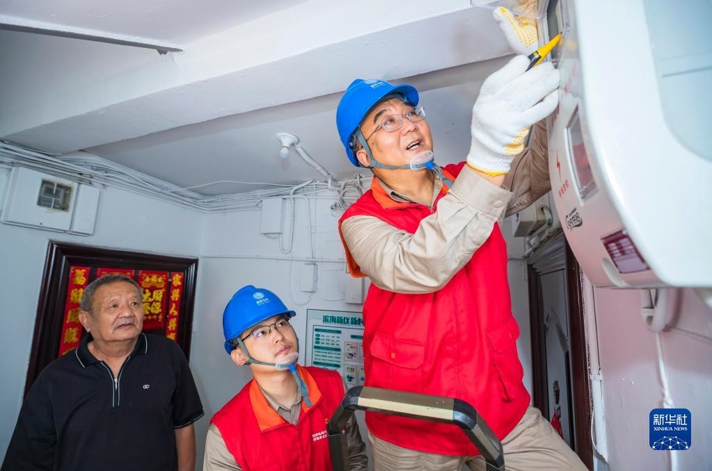 張黎明(右)帶領(lǐng)國(guó)網(wǎng)天津?yàn)I海黎明共產(chǎn)黨員服務(wù)隊(duì)到天津市濱海新區(qū)丹東里小區(qū)為居民查看電表(2022年7月15日攝)。新華社發(fā)(李津攝)