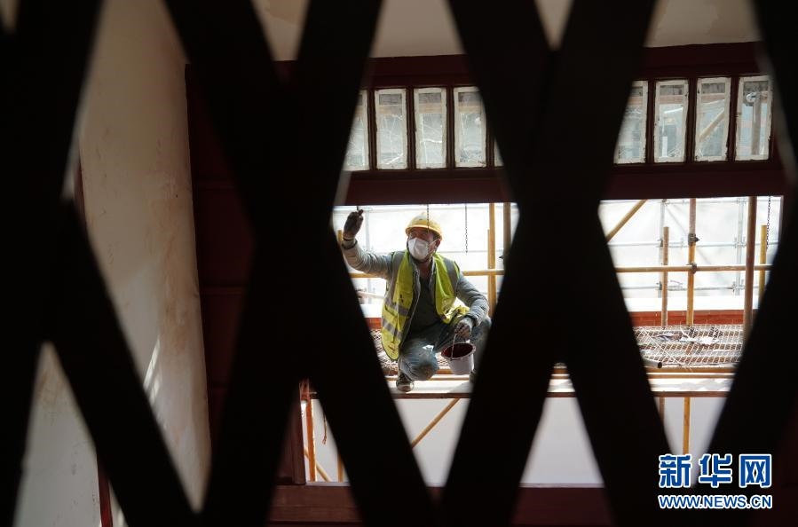 2021年1月14日,工人在修繕現(xiàn)場施工。2020年11月17日起,中共一大會(huì)址及原展廳暫停對(duì)外開放實(shí)施修繕改造。新華社記者 劉穎 攝