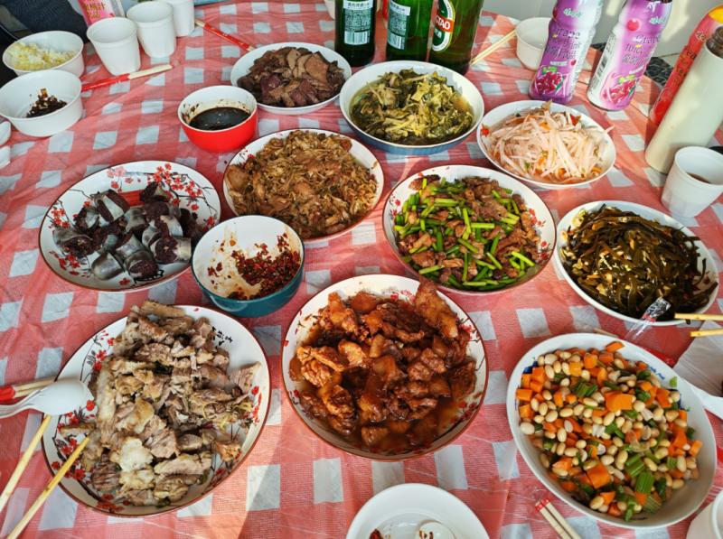 忙活了一上午,紅白相間的桌布上各類菜品早已擺得滿滿當(dāng)當(dāng),除了位居主位的殺豬菜,還多了許多“衍生作品”:醬燜肉、汆白肉、蒜苔炒肉、酸菜炒肉、涼拌豬肝、豬血腸、涼拌海帶條、芥菜絲……圍坐一圈的不止家人,還有左鄰右舍。無(wú)需主人過(guò)多招呼,筷子便紛紛探向鍋中。窗外寒風(fēng)漸歇,霧氣也被陽(yáng)光驅(qū)散,而在溫暖的屋子里,鍋氣蒸騰,模糊了窗上的冰花,也潤(rùn)濕了每一雙帶著笑意的眼睛。這不僅僅是一頓飯,更是鄉(xiāng)里鄉(xiāng)親們對(duì)生活最熱烈的擁抱。