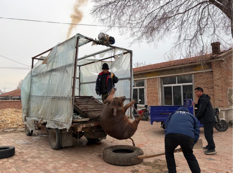 吃殺豬菜一向講求男女分工,家中的男子負(fù)責(zé)抓豬屠宰,女性們則負(fù)責(zé)后續(xù)的備菜烹煮工作。男人們穿上厚實(shí)的棉襖,呵著白氣走向豬圈,用早已準(zhǔn)備好的繩索,麻利地將豬的四肢捆扎結(jié)實(shí)。隨后,幾人合力將豬抬到宰豬的車上,王國(guó)春深吸一口氣,拿起殺豬刀,對(duì)準(zhǔn)豬的脖頸,動(dòng)作干脆利落。鮮紅的豬血順著事先準(zhǔn)備好的大盆緩緩流淌,不一會(huì)兒就接了滿滿一盆。殺完豬,男人們顧不上休息,就趕忙用滾燙的開(kāi)水給豬褪毛,鐵刮子在豬身上來(lái)回刮擦,發(fā)出“唰唰”的聲響,不一會(huì)兒,原本黑乎乎的豬就變得白白凈凈。緊接著,他們立刻將豬開(kāi)膛破肚,把內(nèi)臟分門別類地整理好,豬頭、豬蹄也被仔細(xì)地清洗干凈,準(zhǔn)備著后續(xù)的處理?! ?/p>