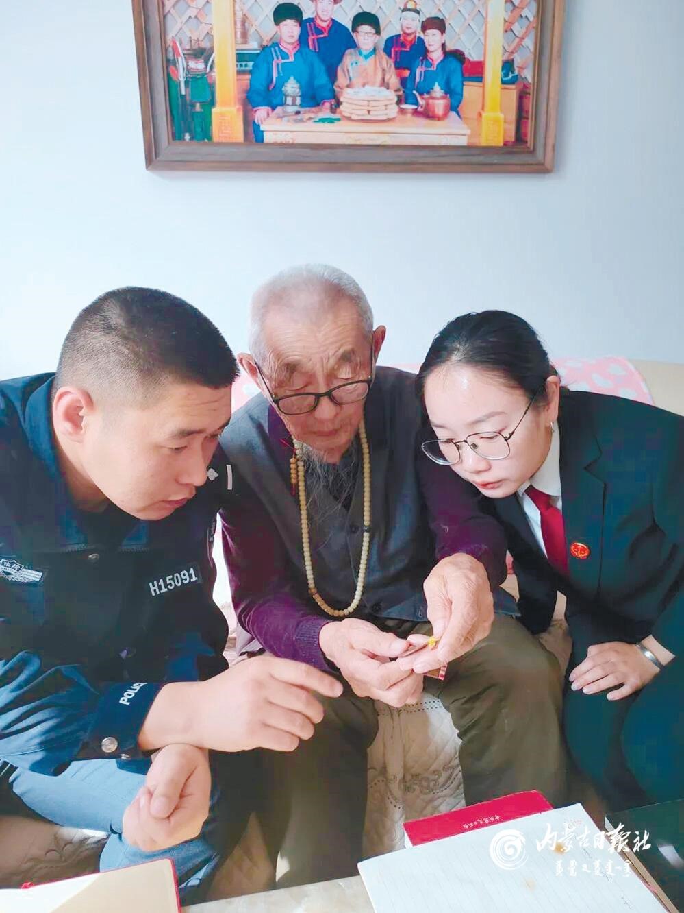 老黨員為青年干警介紹自己獲得的勛章。近日,錫林郭勒盟蘇尼特左旗人民法院組織青年干警來(lái)到91歲的老黨員阿日德那巴吉爾家中,聆聽(tīng)老人講述黨史故事,接受革命傳統(tǒng)教育。(內(nèi)蒙古日?qǐng)?bào)記者 李晗 攝)