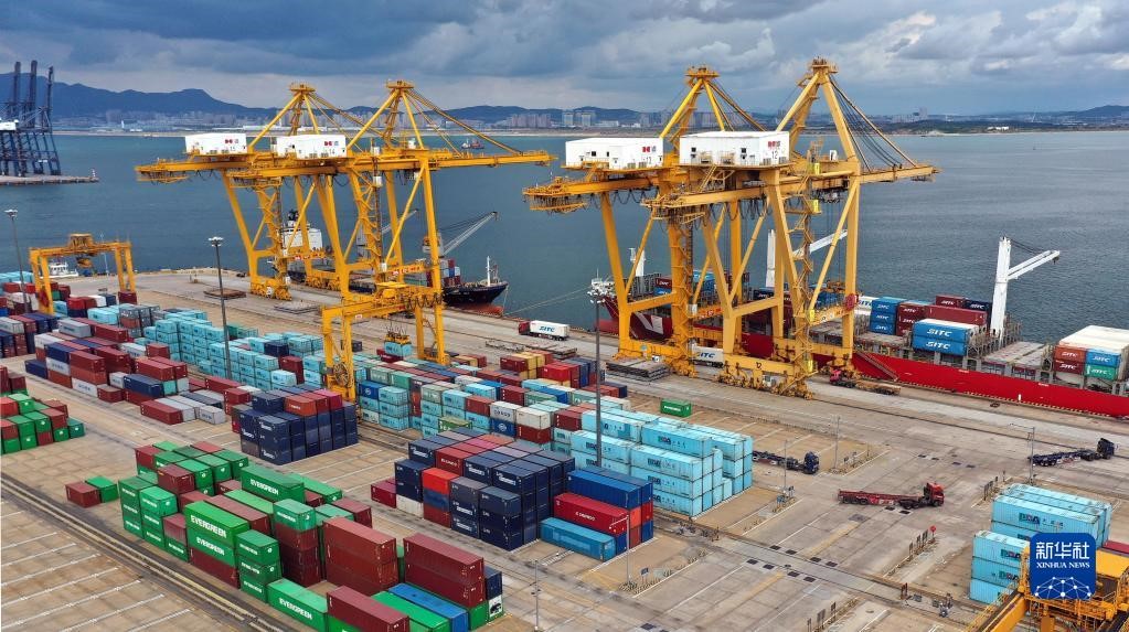 2020年9月24日,貨輪在大連港大連集裝箱碼頭有限公司港口裝卸集裝箱(無(wú)人機(jī)照片)。新華社記者 姚劍鋒 攝