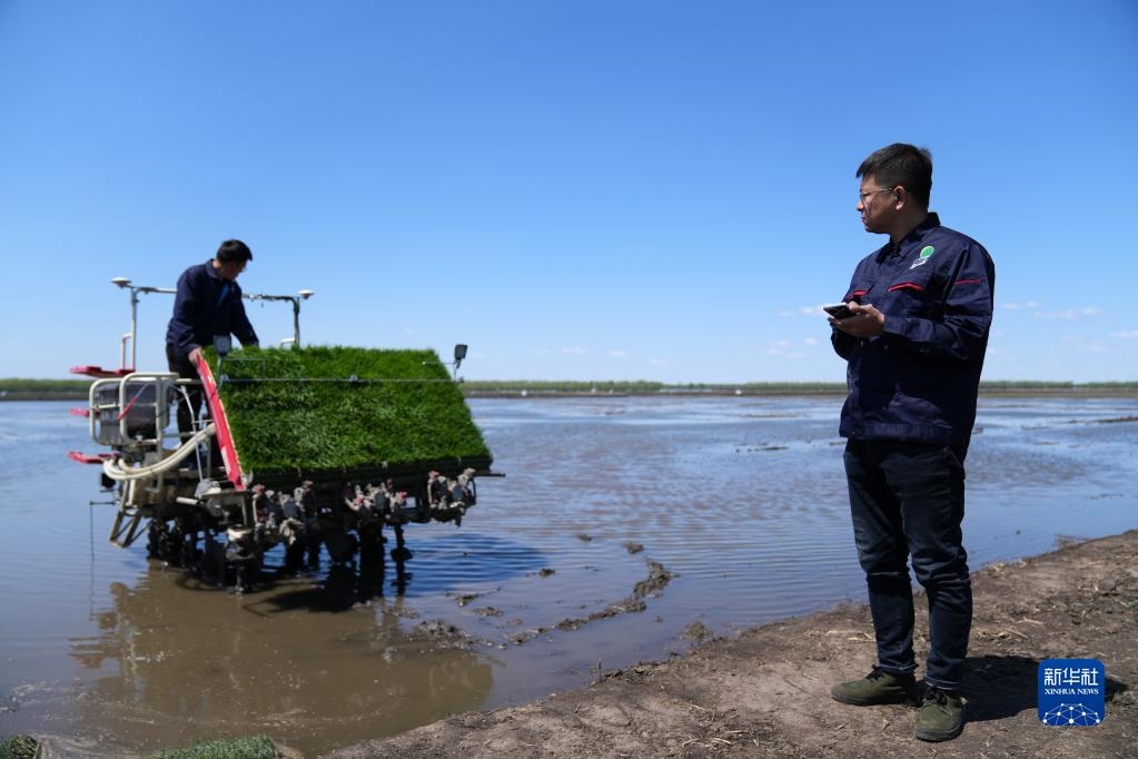 在北大荒集團建三江分公司七星農(nóng)場有限公司萬畝稻田邊,農(nóng)機手陸向導連續(xù)輕觸兩下手機,一臺帶有北斗導航系統(tǒng)的無人駕駛插秧機開始作業(yè)。