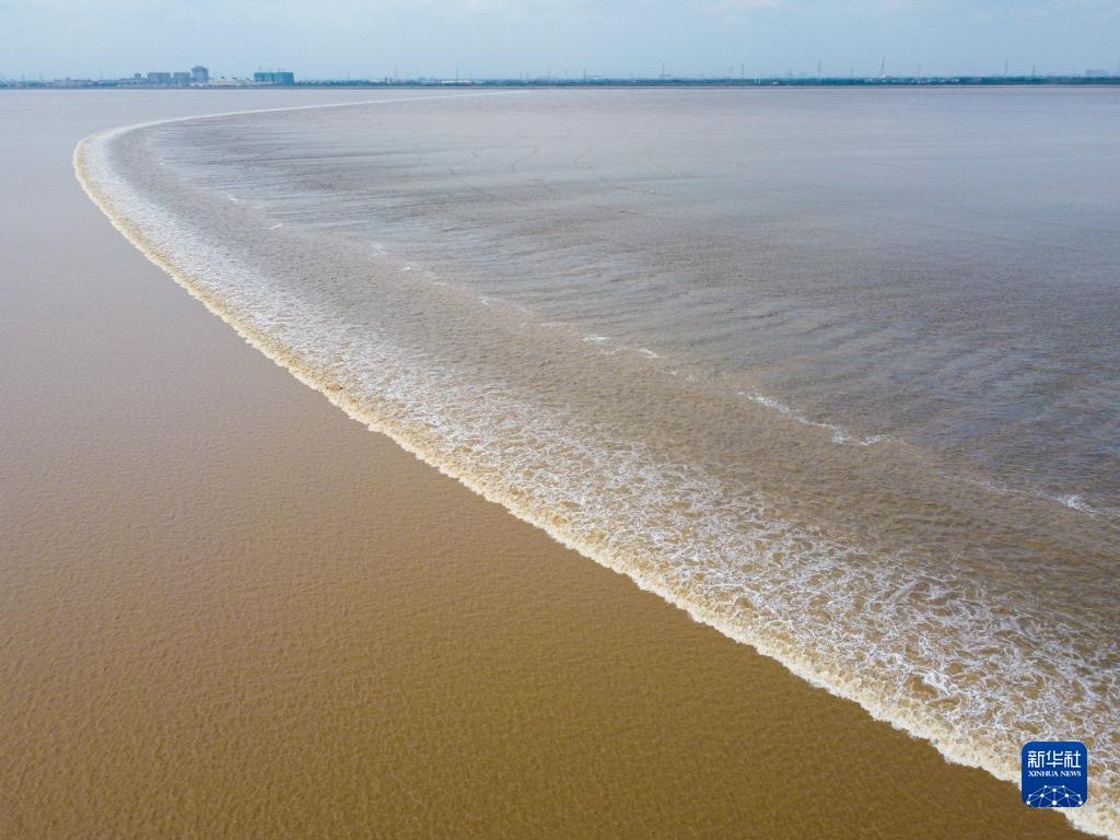 這是在杭州市錢塘新區(qū)拍攝的錢塘江一線潮奇觀(2020年10月5日攝,無人機(jī)照片)。新華社記者 江漢 攝