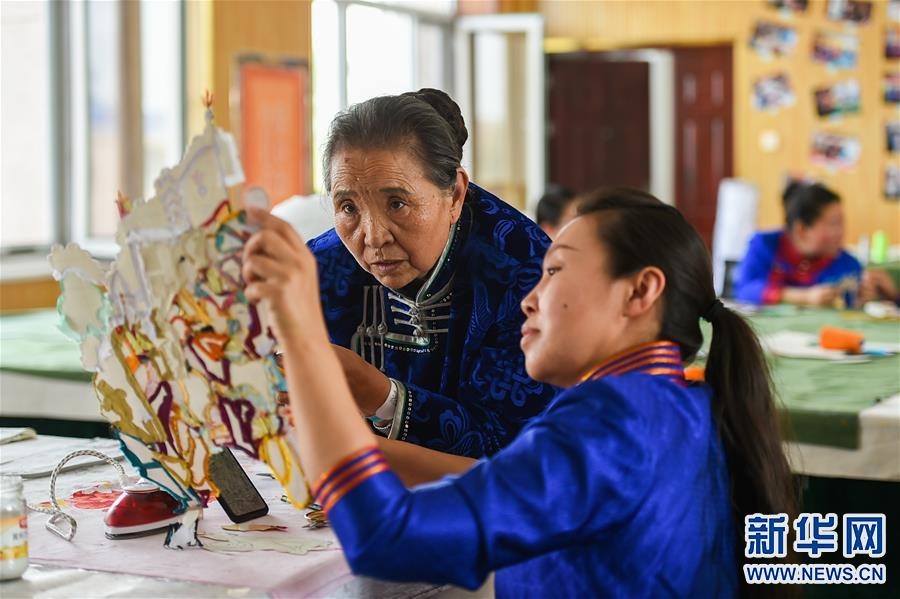 陶格日勒(左)在內(nèi)蒙古阿拉善盟阿拉善左旗的馬鬃繞線蒙古唐卡傳習(xí)所向牧民傳授制作技藝。 -